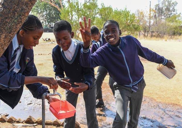 2023年9月12日,在博茨瓦纳马哈拉佩的一所公立学校,学生在洗餐具。马哈拉佩位于博茨瓦纳首都哈博罗内以北约200公里,近年来,用水困难一直困扰着当地居民。原有的旧水厂每天只能处理约16兆升生活用水,而居民用水量需求达20兆升。2022年,由中国建筑博茨瓦纳有限公司设计、施工的当地自来水厂升级改造项目正式移交给博茨瓦纳自来水公司,新增了一组日处理能力18兆升的设备。新建的澄清池有效减少维护保养的时间和成本,节约了能源。不仅如此,新水厂还增加了活性炭过滤工艺和二氧化氯消毒杀菌工艺,极大提高了净水质量。完成后,整个水厂的日处理能力增加到34兆升,使马哈拉佩以及周边居民大大受益。